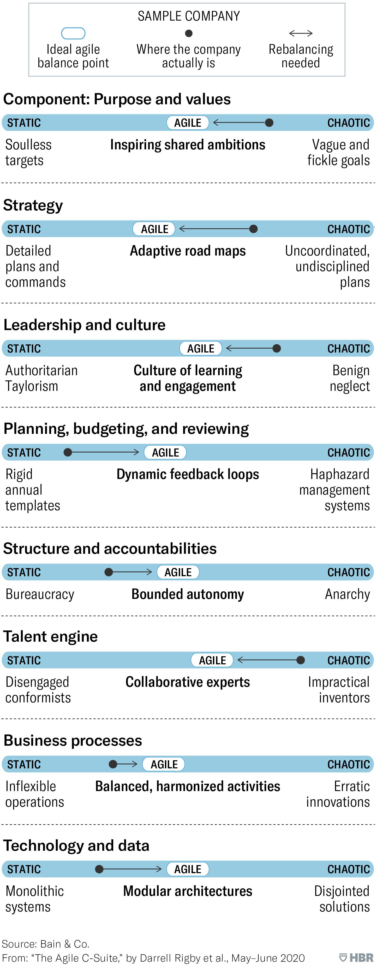 This Harvard Business Review (“HBR”) article explores the transformational shift toward agility in the executive suite and underscores its necessity to stay competitive against nimble market entrants that disrupt traditional business models with innovative approaches and customer-centric strategies. HBR articulates a clear blueprint for senior executives aiming to inject agility into their strategic roles, emphasizing that true agility goes beyond mere methodology—it requires a fundamental shift in how leaders think, collaborate, and drive their organizations forward. This graphic pulled from HBR’s article offers a great visual summary: